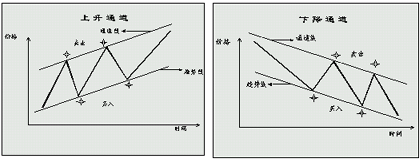 當(dāng)價(jià)格上升或下降時(shí),價(jià)格變動(dòng)的范圍常常局限于一個(gè)狹窄的帶狀區(qū)內(nèi),這個(gè)區(qū)域稱(chēng)為“通道”,當(dāng)價(jià)格滯留于所局限的軌道內(nèi)時(shí),交易者能夠預(yù)測(cè)價(jià)格的變動(dòng),從而確定買(mǎi)賣(mài)的時(shí)機(jī),即在通道下方買(mǎi)入,在通道上方賣(mài)出。