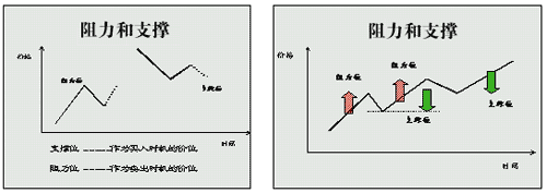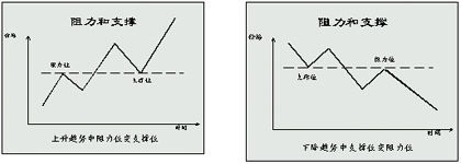 當(dāng)外匯市場(chǎng)中賣(mài)方力量超出買(mǎi)方力量,價(jià)格向上勢(shì)頭受阻,調(diào)頭向下,形成一個(gè)波峰,這一價(jià)位稱(chēng)為阻力位。當(dāng)買(mǎi)方力量大于賣(mài)方力量,價(jià)格受到支持向上反彈,形成一個(gè)波谷,這一價(jià)位稱(chēng)為支撐位。在上升市中,之前的最高價(jià)往往會(huì)成為阻力位。在下跌市中,之前的最低價(jià)往往會(huì)成為支撐位。