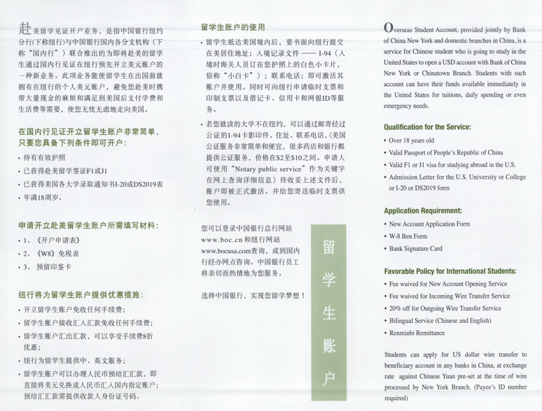 中國(guó)銀行紐約分行及紐約皇后分行為即將赴美求學(xué)的留學(xué)生,提供全新的“美好前程”留學(xué)見(jiàn)證開(kāi)戶產(chǎn)品套餐。該產(chǎn)品套裝包括美元有息支票賬戶、銀行卡、支票、網(wǎng)上銀行一攬子產(chǎn)品服務(wù),具備靈活的美國(guó)境內(nèi)資金劃轉(zhuǎn)和支付功能。留學(xué)生可通過(guò)中國(guó)銀行境內(nèi)分支機(jī)構(gòu)(不含在我國(guó)香港特別行政區(qū)、澳門(mén)特別行政區(qū)及臺(tái)灣地區(qū)的分支機(jī)構(gòu))見(jiàn)證申請(qǐng)產(chǎn)品服務(wù),出國(guó)前就獲得美國(guó)當(dāng)?shù)劂y行卡、臨時(shí)支票、網(wǎng)上銀行。個(gè)人支票和銀行卡能輕松滿足大額學(xué)費(fèi)支付和日常消費(fèi)需求,網(wǎng)上銀行具備便捷查詢賬戶交易和匯款轉(zhuǎn)賬等功能,足不出戶即可輕松管理您的境外賬戶。